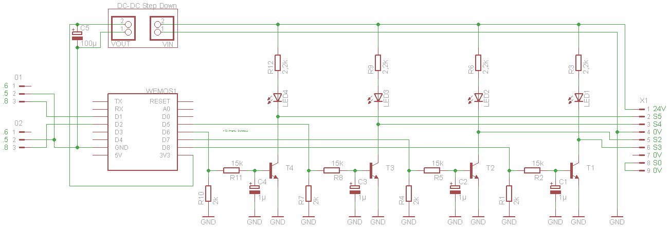 Um die vier Eingänge der UAP 1 ansteuern zu können, benötigt man noch vier einfache Schalttransistoren. Diese Transistoren können mit den 3,3V Signalen des ESP die 24V der UAP 1 schalten. Der Blogger Otto gibt auf seinem Blog einen Strom von 4,8mA an, wenn die Eingänge der UAP 1 auf Masse gezogen werden. Die Spannung an den offenen Eingängen gibt er mit 21V an. Da bei mir noch Unmengen an DDR Transistoren in den Kisten liegen habe ich mich für einen SC237 npn-Tansistor entschieden. Der Vergleichstyp ist heute der BC237. Dieser kann laut Datenblatt Spannungen bis zu 45V und Ströme bis zu 100mA schalten. Also völlig ausreichend für diesen Einsatzzweck. Die Pull-Down Widerstände (R1,R4,R7,R10) bringen Ordnung in das etwas zickige Bootverhalten der GPIO des ESP. Ohne diese Widerstände werden die GPIO beim Booten des ESP einmal kurz auf High gezogen. Das ist natürlich unbedingt zu Vermeiden. Die Tiefpässe sollen weitere Störungen verhindern die zu einem ungewollten Schalten der Ausgänge führen können.