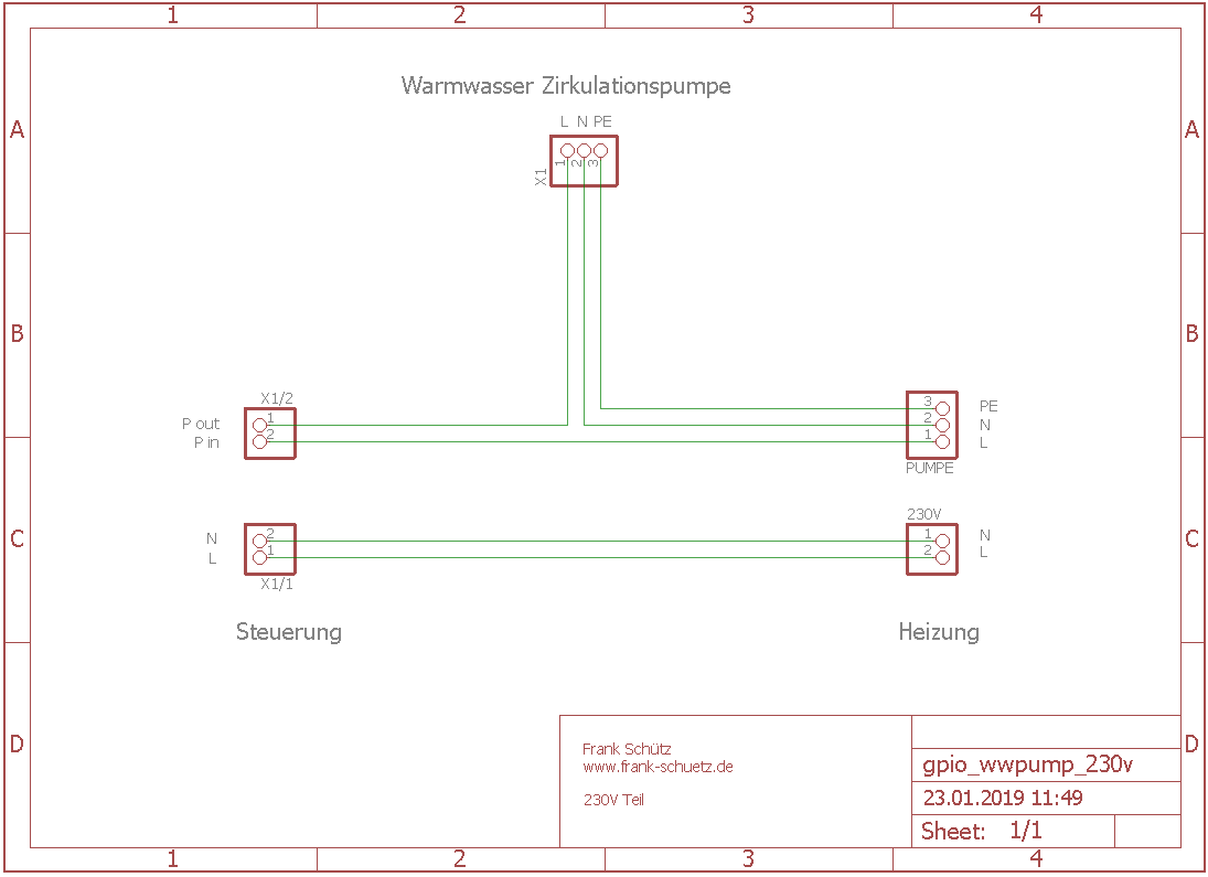 Als 230V Zuleitung habe ich ein Kabel 3x1,5mm² direkt an die Zuleitung der Heizung angeschlossen. Da die Schaltung in Serie mit der Heizungssteuerung liegt reicht für die Steuerung der Pumpe eine 2x1,5mm² Leitung völlig aus. Ich habe die Schaltung in der Heizung eingeschliffen. Damit habe ich weiteren Installationsaufwand vermieden. Es wird einfach die Phase der Pumpe aus der Heizung ausgeklemmt und mittels geeigneter Verbinder mit der Leitung P out der Platine verbunden. Die Leitung P in wird in die frei gewordene Klemme des Pumpenanschlusses an der Heizung geklemmt.