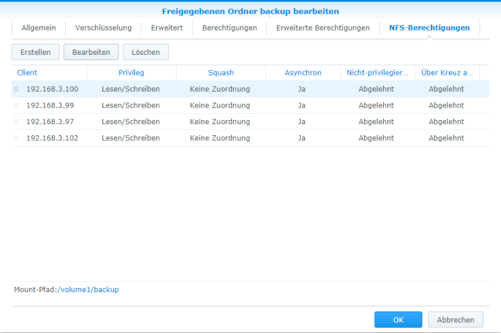 Wenn man ein Backup erzeugt und dieses auch auf einem anderen Datenträger speichern möchte kann man dafür auch eine NFS-Verbindung nutzen. Es gibt verschiedene Vorteile aber auch Nachteile gegenüber einer SMB Verbindung. Als erstes ist hier die Geschwindigkeit und lässt sich in aller Regel einfacher aufsetzen. Ein Nachteil ist aber zum Beispiel die Rechteverwaltung. Die ist unter NFS nur primitiv. Aus diesem Grund kann man zum Beispiel durch eine geschickte Konfiguration die Daten vor anderen Benutzer ausblenden. In dem Beispiel unten habe ich die Konfiguration zwischen einer Synology, als NFS-Server und einem Debian System als Client notiert.