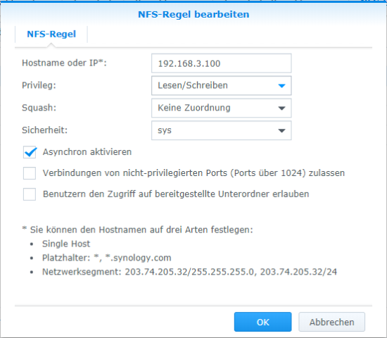 Die Einrichtung auf der Synology ist durch das DSM recht übersichtlich. Zunächst aktiviert man in der Systemsteuerung -> Dateidienste den NFS-Dateidienst auf der Synology. Der Punkt befindet sich ganz unten auf der Registerkarte SMB/AFP/NFS. Danach geht man einfach auf "Gemeinsame Ordner" und erstellt einen neuen gemeinsamen Ordner bzw. wählt einen aus. Über "Bearbeiten" und die Registerkarte "NFS-Berechtigungen" kommt man zu den entsprechenden Einstellungen. Hier erstellt man eine "NFS-Regel" die für einen Client Gültigkeit hat.
